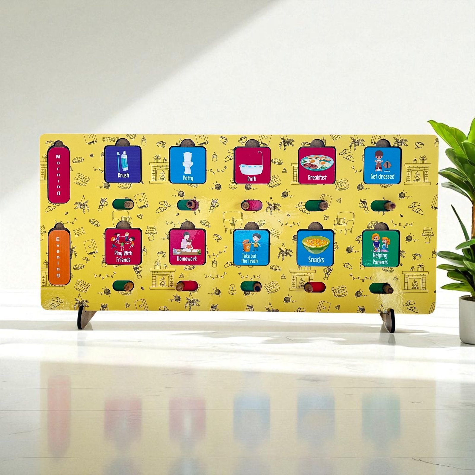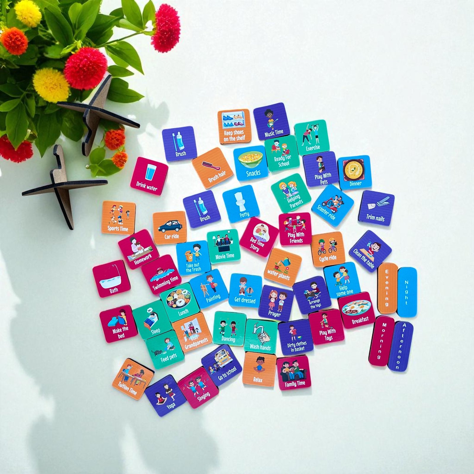 Turn everyday tasks into an easy, fun routine! This Daily Routine Board helps kids understand their day with colorful time blocks (Morning, Afternoon, Evening, Night) and matching activity tiles like brushing, breakfast, homework, playtime, and more.