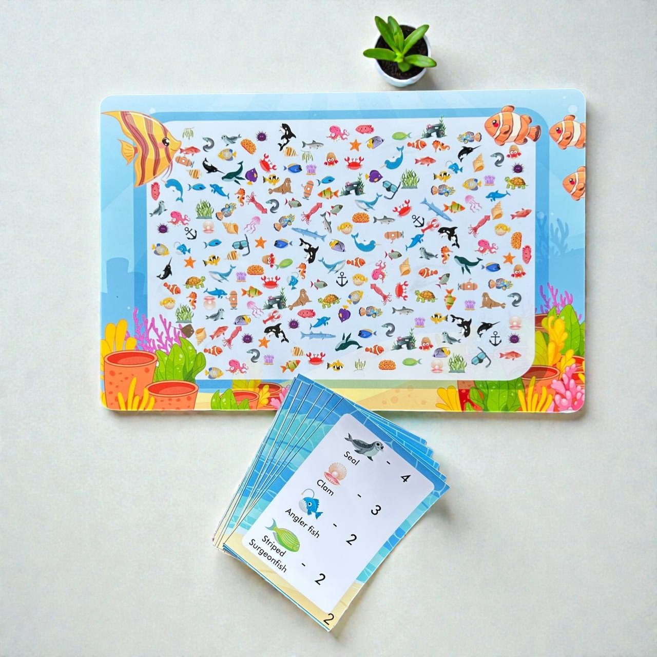 Packed with colorful ocean creatures, children search, count, and mark each item using the wipe-and-clean marker, making it perfect for repeat play.