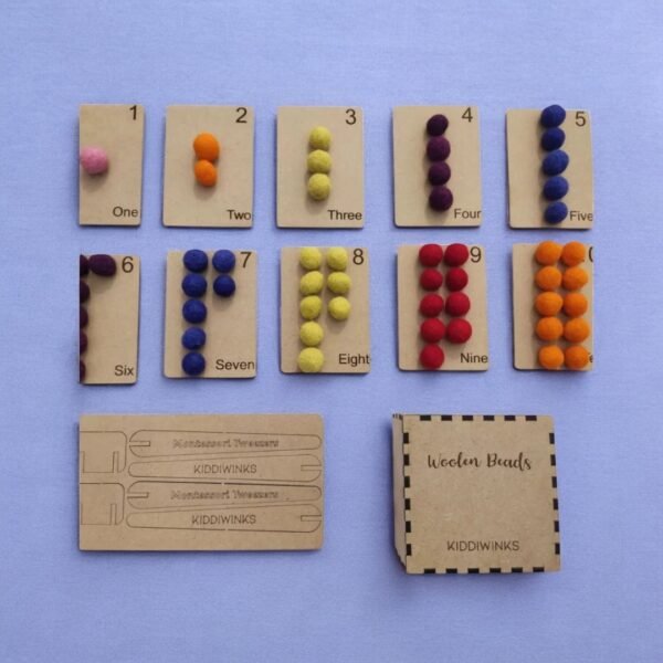 These minimal designed flashcards will help children learn their numbers while counting to place the woolen balls on the given circle. Each flashcard has a circle cutout according to the number on the card. Numbers 1 – 10 are the base for the entire math system for kids to recognise that the numbers have an order.